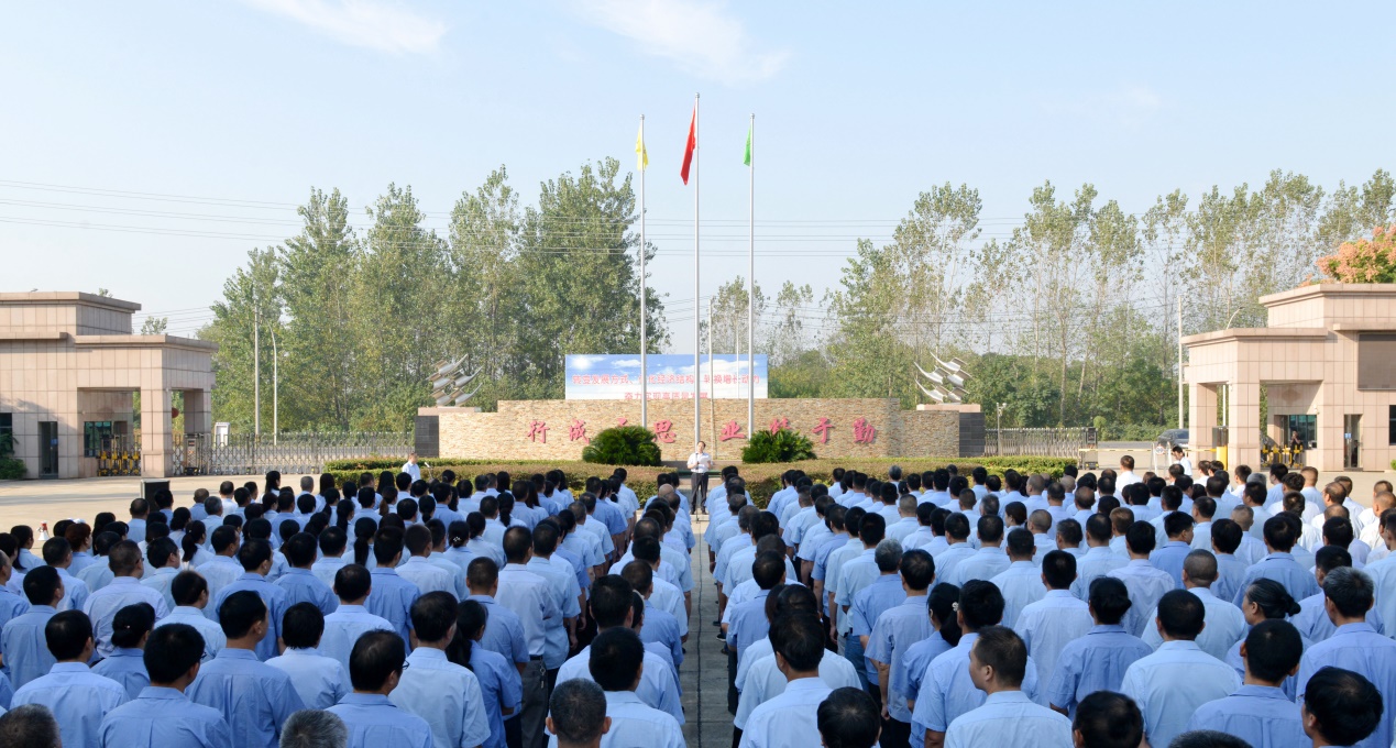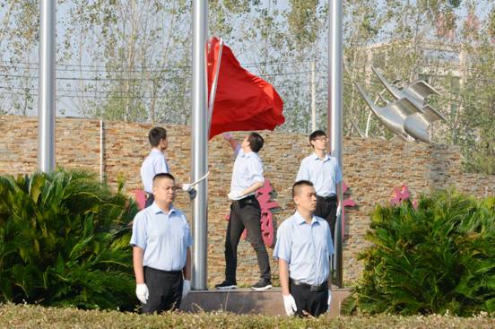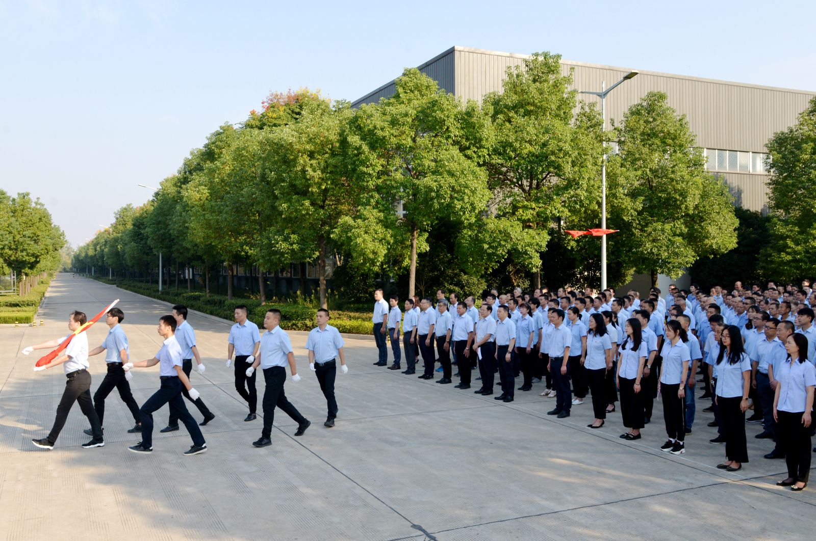 8:20時(shí),活動(dòng)儀式在總經(jīng)理焦倫進(jìn)的主持下啟動(dòng),七名旗手邁正步從員工方隊(duì)繞過,直達(dá)旗壇,行進(jìn)口令威武響亮。在主持人的指令下,三名旗手將一面鮮艷的五星紅旗在莊嚴(yán)的國(guó)歌聲中徐緩地升上天空,員工方隊(duì)注目國(guó)旗,唱起雄壯的國(guó)歌。