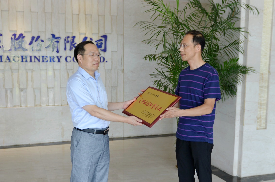 8月18日,天門市市場監(jiān)督管理局對天門紡機獲得的"文明誠信私營企業(yè) "榮譽進行現(xiàn)場授牌,黨委書記魯?shù)挛拇砉窘优?。