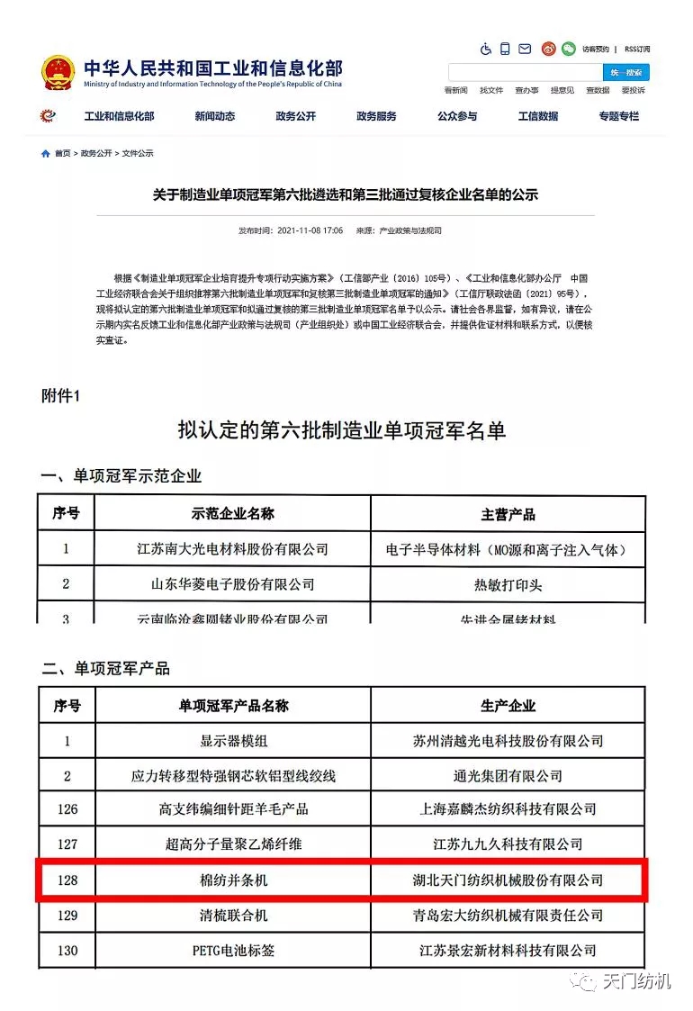 近日,國家工信部和中國工業(yè)經(jīng)濟聯(lián)合會發(fā)布通知(工信廳聯(lián)政法函〔2021〕95號),擬認定天門紡機并條機為“單項冠軍產(chǎn)品”。至此,天門紡機所產(chǎn)的系列并條機成為了國內(nèi)唯一獲此殊榮的棉紡并條機。