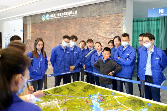 公司全體青年員工坐乘大巴車(chē)來(lái)到了張家湖國(guó)家濕地公園,它位于湖北省天門(mén)市九真鎮(zhèn),湖泊水域面積6.53平方公里,平均水深1.8米,是典型的淺水湖泊,其濕地類型屬內(nèi)陸淡水湖泊,是天門(mén)市最大的湖泊,也是湖北省保持原始生態(tài)最好的湖泊之一。到上世紀(jì)二十年代,隨著湖區(qū)淤積、湖泊萎縮,西部形成張家湖,東部形成石家湖。到達(dá)目的地后,公園的工作人員進(jìn)行了熱情地接待,大家仿佛穿越到了原生態(tài)的農(nóng)耕時(shí)代,湖泊密布,半島羅列,河湖相通,一派水鄉(xiāng)澤國(guó)、湖光田園景象。來(lái)到觀鳥(niǎo)臺(tái),登高望遠(yuǎn),一覽張家湖美景和各種野生鳥(niǎo)類。公園設(shè)有科普館,里面陳列了濕地的人文風(fēng)貌及天門(mén)的特色文化,還有各種攝影大片。