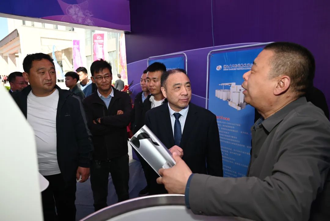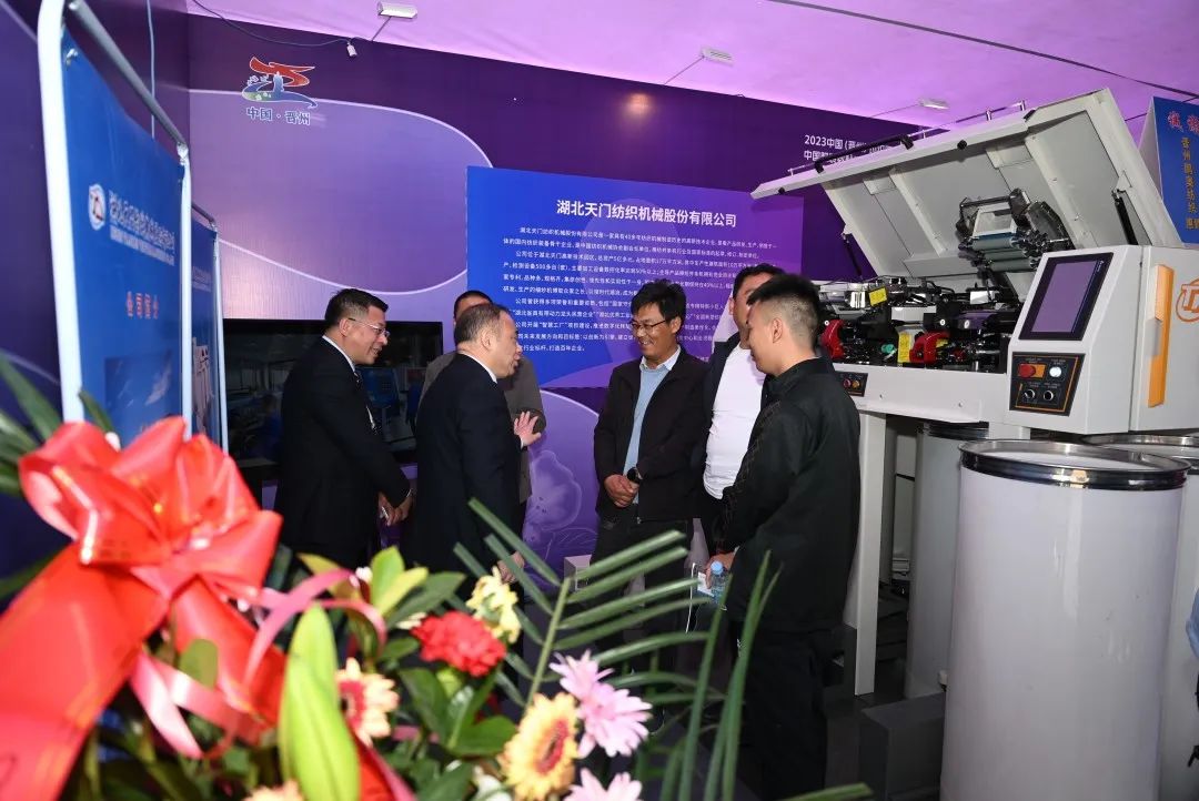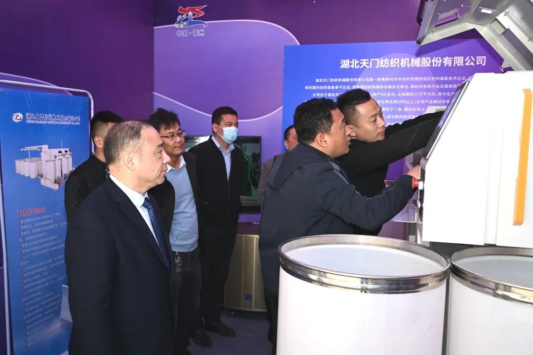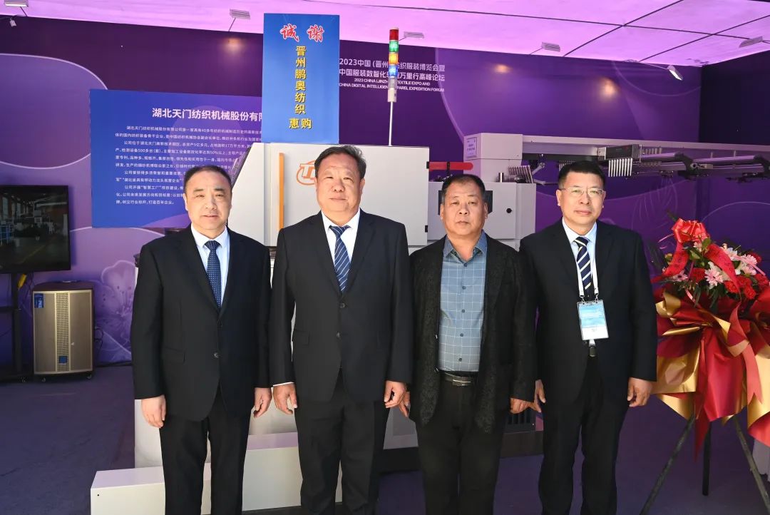 天門紡機總經(jīng)理焦倫進(jìn)向蒞臨公司展位的晉州市長王林(右2)、中國服裝協(xié)會常務(wù)副會長楊金純(右1)、晉州市紡織服裝行業(yè)協(xié)會會長李永強(左1)介紹公司與晉州紡織企業(yè)合作情況