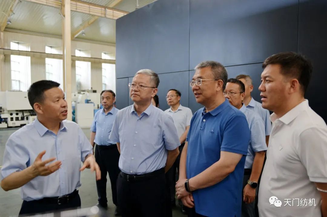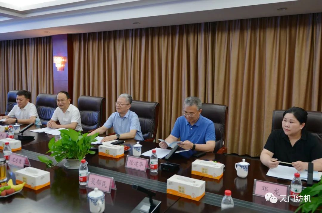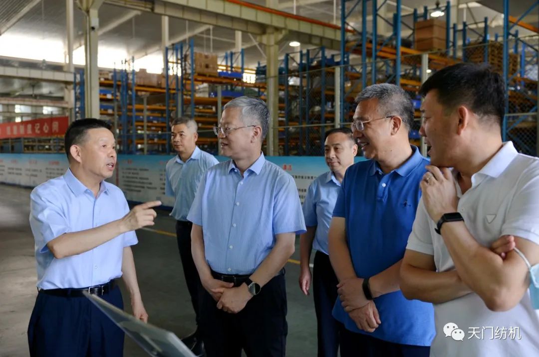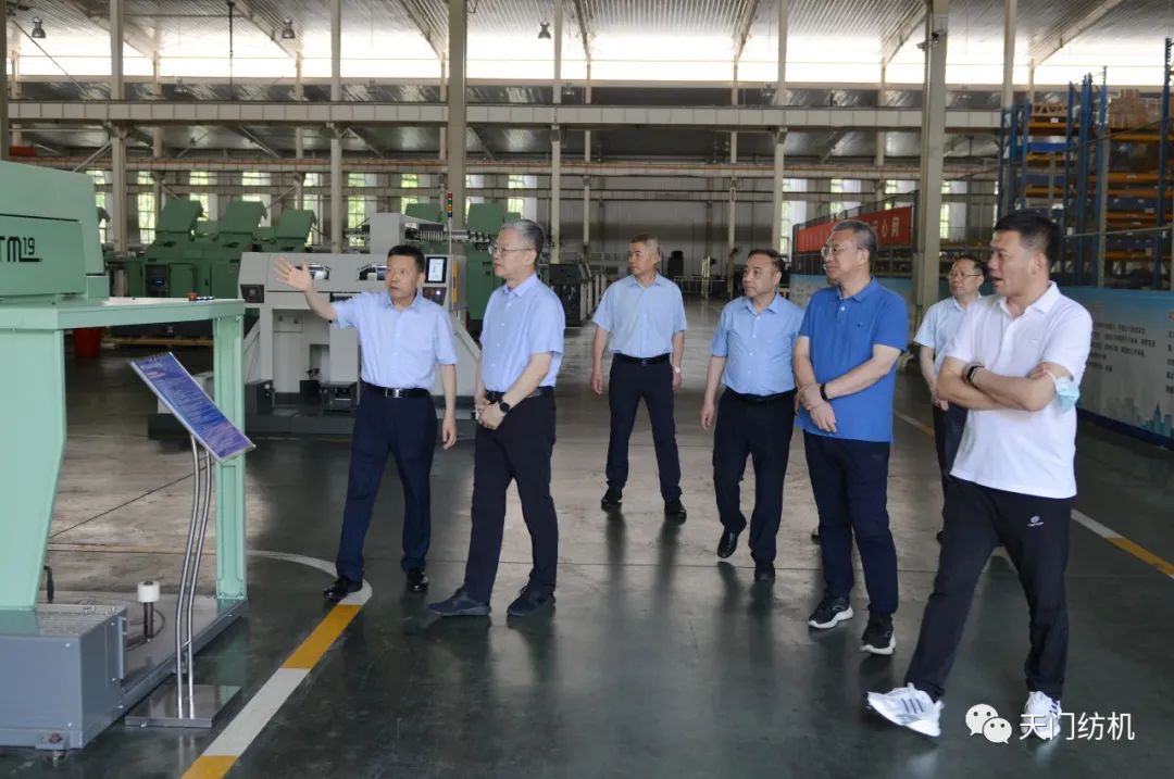 2023年6月27日下午,中國紡織工業(yè)聯(lián)合會(huì)秘書長夏令敏,中國紡織工業(yè)聯(lián)合會(huì)流通分會(huì)副會(huì)長徐建華、秘書長王水元蒞臨天門紡機(jī)調(diào)研,湖北省經(jīng)信廳副廳長周開斌、消費(fèi)品工業(yè)處副處長鄧龍陪同調(diào)研。