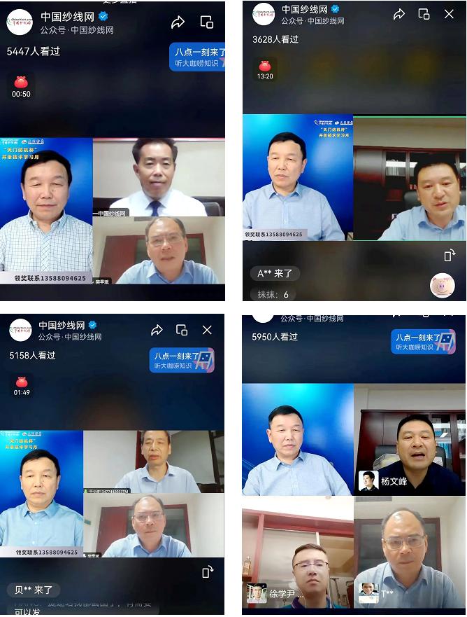 本次活動(dòng)進(jìn)行了6場(chǎng)直播。其間,天門紡機(jī)副總經(jīng)理?xiàng)钗姆寰图徔椦b備的發(fā)展趨勢(shì)作了深度剖析,分享了并條機(jī)牽伸形式、傳動(dòng)方式、換筒方式及自調(diào)勻整等方面的專業(yè)知識(shí);天門紡機(jī)品控總監(jiān)樊早斌、售后服務(wù)中心主任于少波分別就并條機(jī)操作、工藝要求、維護(hù)保養(yǎng)、常見(jiàn)問(wèn)題排查等方面的知識(shí)和經(jīng)驗(yàn)進(jìn)行了交流。線上學(xué)習(xí)氛圍濃厚,平均每場(chǎng)都有近6千人參加學(xué)習(xí),總計(jì)超3萬(wàn)余人。