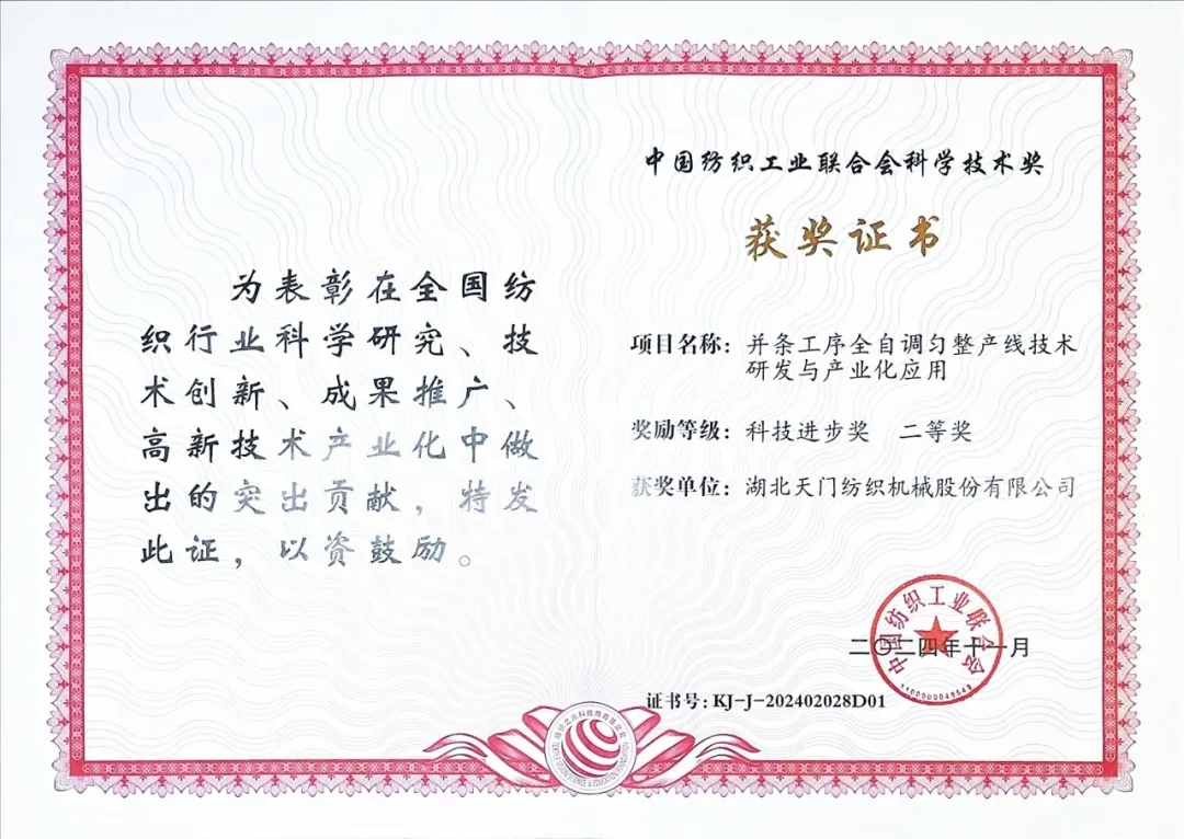 2024年11月12日,在北京人民大會堂召開的2024年度中國紡織工業(yè)聯(lián)合會科學技術獎勵大會傳來喜訊,由天門紡機主導,武漢紡織大學、安徽華茂紡織股份有限公司、武漢銀橋南海光電有限公司等單位合作開發(fā)的“并條工序全自調(diào)勻整產(chǎn)線技術研發(fā)與產(chǎn)業(yè)化應用項目”獲得2024年“中國紡織工業(yè)聯(lián)合會科學技術獎”科技進步二等獎。