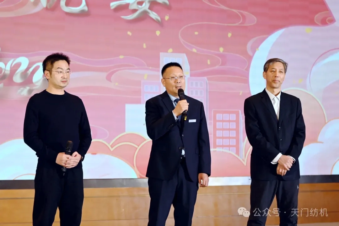 雙清智能總經(jīng)理蔡文超(左)、天門紡機副總經(jīng)理肖少華(中)、紗線網(wǎng)常務(wù)副總裁孫其海(右)為晚宴致辭