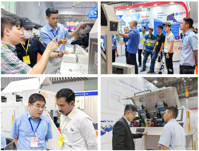 越南展會(huì)現(xiàn)場(chǎng)人流如織,其中天門紡機(jī)展區(qū)尤為矚目,開(kāi)展期間分別迎來(lái)HANO SIMEX、VICOTEX、HONG LINH、NHA TRANG、THANG CONG、PHU BAI等50余家越南紡企的到訪,T1系列并條機(jī)憑借卓越性能表現(xiàn),引發(fā)現(xiàn)場(chǎng)觀眾駐足,多位老客戶對(duì)T1系列并條機(jī)的穩(wěn)定性與高效產(chǎn)能給予高度評(píng)價(jià)。